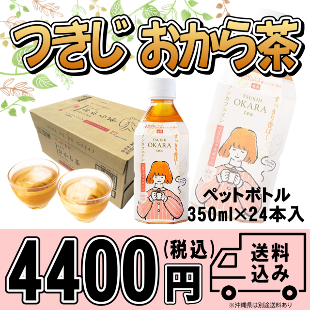 つきじおから茶ペットボトル:350㎖✕24本入/ケース 目指したのは安心して飲めるやさしくてピュアな飲料。原料は国産大豆100%使用、名水と名高い富山の「黒部の名水」を使用。香料、着色料未使用でカフェイン・カロリーゼロの為、お子様や妊婦さんにも安心してお飲み頂けます。大豆イソフラボン4.0㎎、焙煎した大豆胚芽20%配合。雑味なくすっきりと香ばしい味が広がります。まとめ買いで定期的に飲むのも、プレゼントやイベントなどにも最適です! 国産大豆100%のおからをパウダー状にして焙煎し、香ばしさをのせてやさしくすっきりとしたおから茶に生まれ変わります。おからはいまだ産業廃棄物として扱われている中、食品ロスをなくそうと、栄養豊富で食べられるものを再活している「つきじおから茶」を当店では応援しています。 ※沖縄県にお住まいの方は配送方法にて【沖縄県 別途送料 ¥300】の選択をお願い致します。 ※外箱に直接送り状・納品書を貼らせていただきますのでご了承ください。 配送予定 : 1~2日以内に発送予定(土日祝除く) お届け日の目安:翌日~翌々日(一部地域を除く) 北海道、沖縄、離島等は3日以上かかる場合がございます。 ※天候や交通状況などによりお届け予定日が遅れる場合がございますのでご了承下さい。